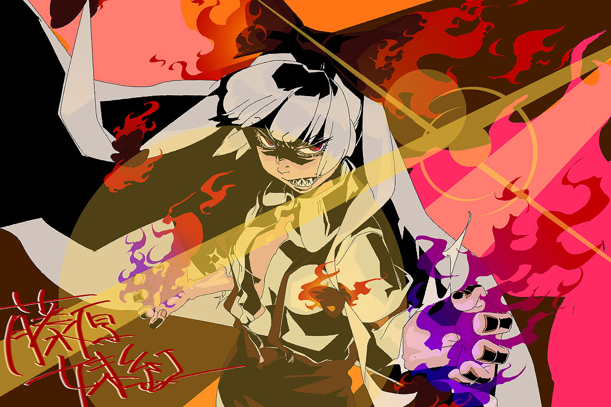 na nto, chaos karen (grimms notes), hansel (grimms notes), hansel (halloween) (grimms notes), grimms notes, 1boy, 1girl, breasts, flashing, greyscale, large breasts, looking at another, monochrome, nipples, smile