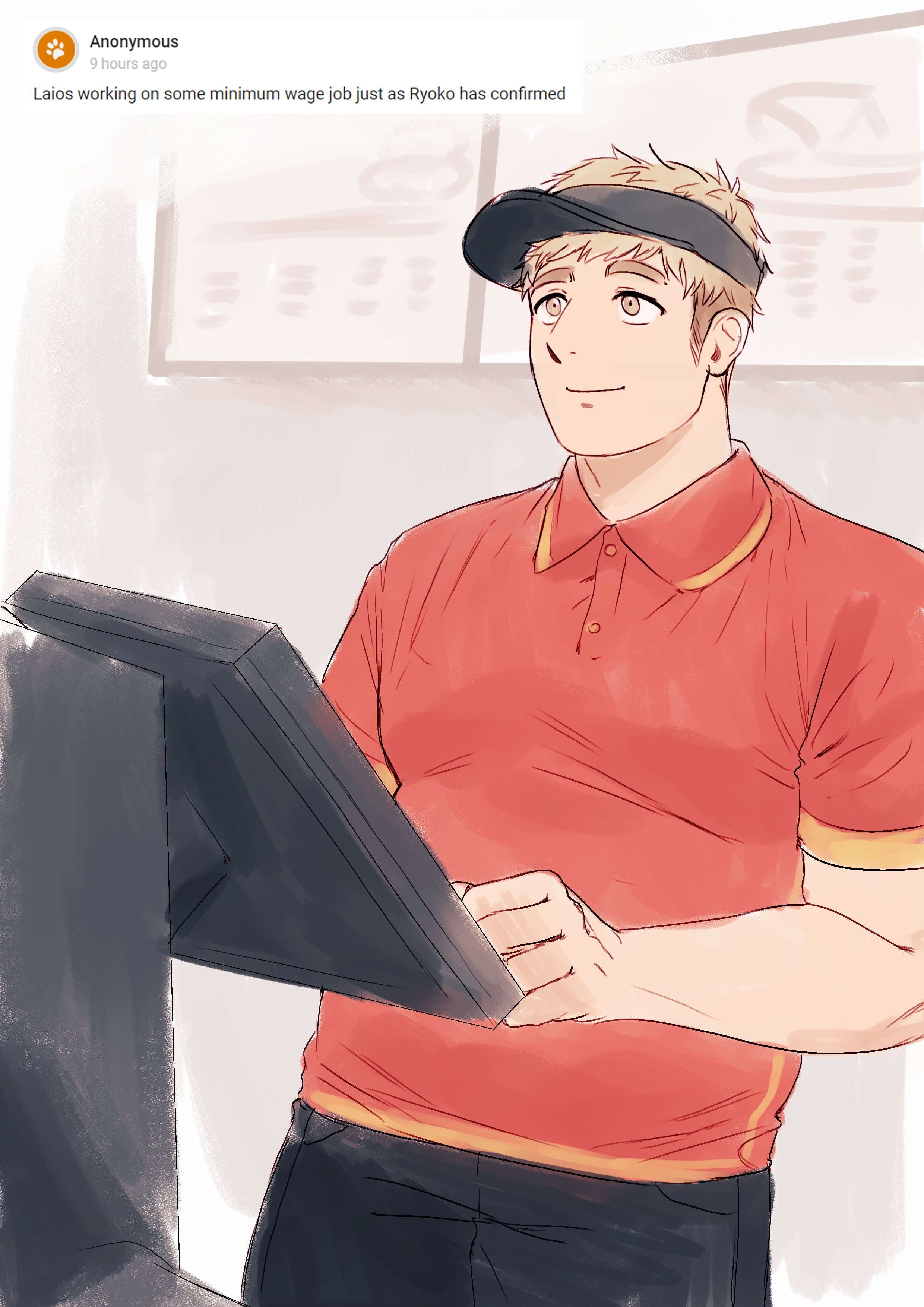 1boyalternate body sizebarabellyblonde haircashiercowboy shotemployee uniformmale focusplumprequest insetshort hairsolostanding