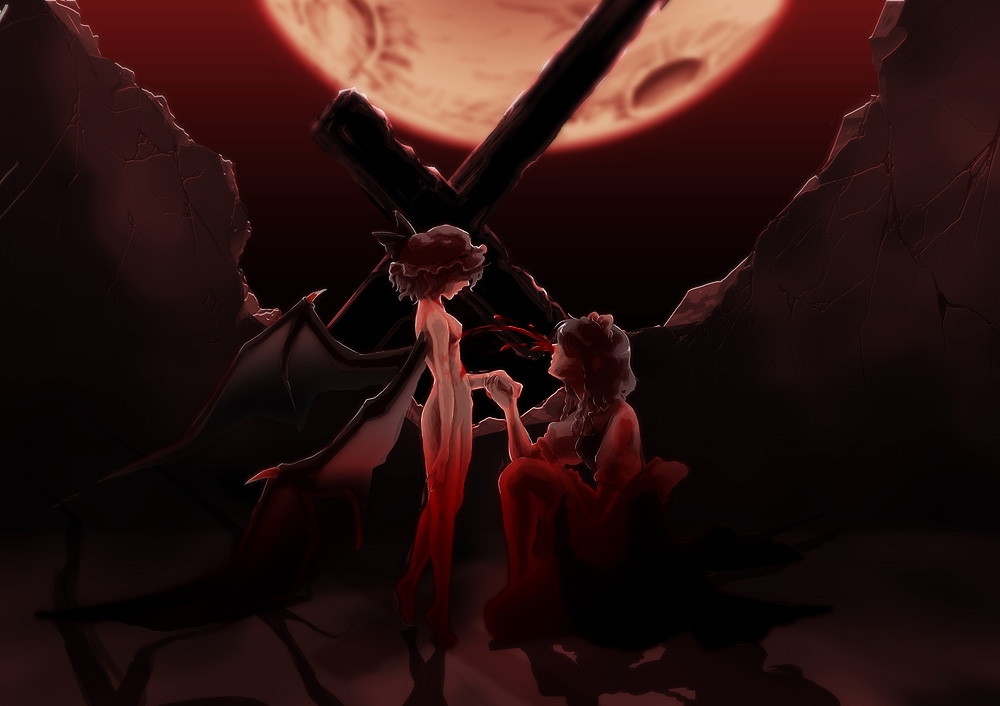 2girlsbat wingsbloodbraidfemale focushatmaidmoonmultiple girlsnosebleednudeoutdoorsshort hairskytwin braidsvampirewings
