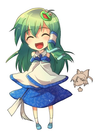 1boy2girlschibiclosed eyesdetached sleevesfemale focusfrogfull bodygreen hairhappyjapanese clotheslong hairmikomultiple girlspartially coloredsimple backgroundsnakesockswhite background