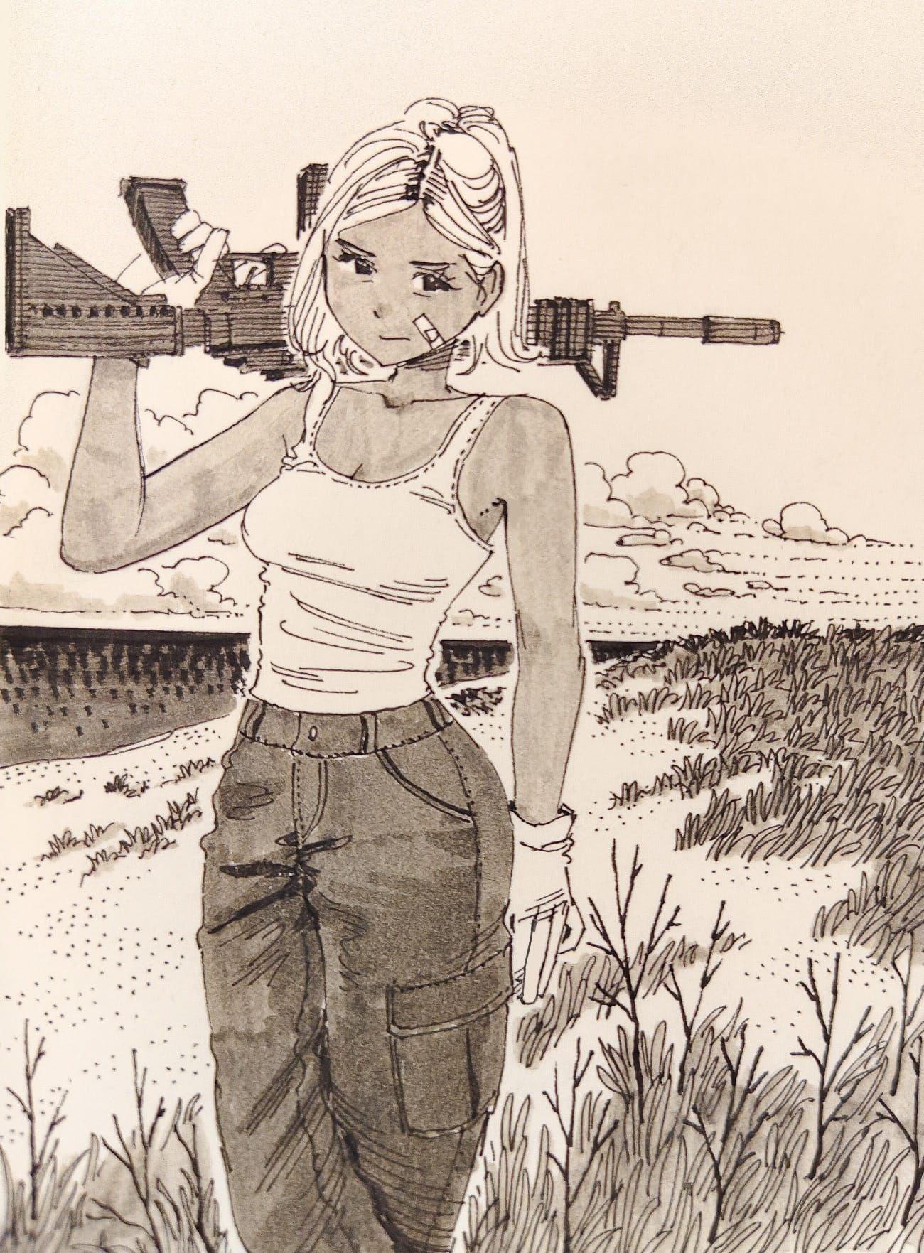 1girlar-15bandaidbandaid on facebreastscollarbonedenimfieldgiftgunholdingholding giftjeansmedium breastsmedium hairmonochromepantsponytailriflesolotantank topweapon