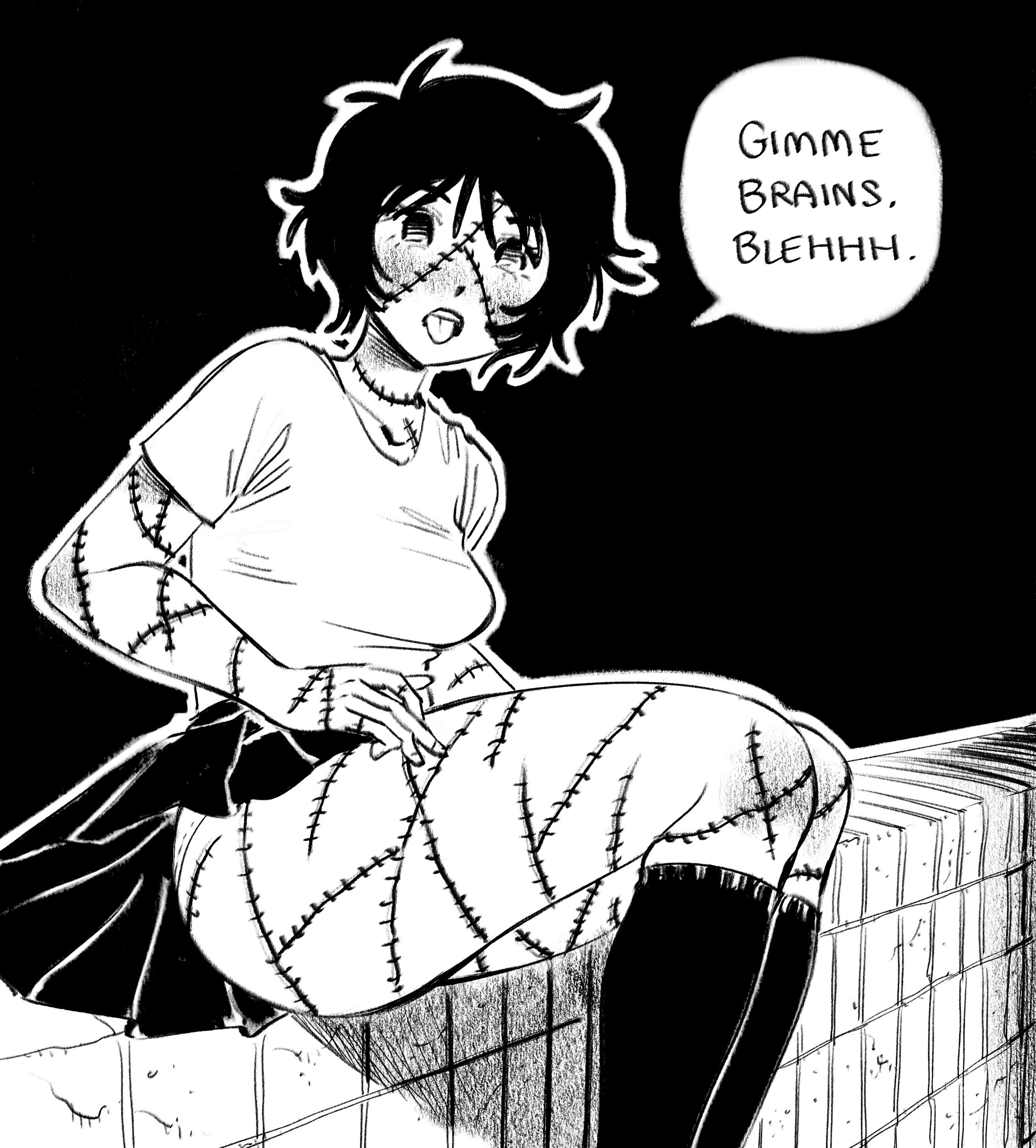 1girlblack hairblack socksblushbreastsenglish textfeet out of framemedium breastspatchwork skinshirtshort hairsockssolostitched armstitched facestitched legstitched neckstitchesthick thighsthighstonguetongue outwhite shirtzombie costume