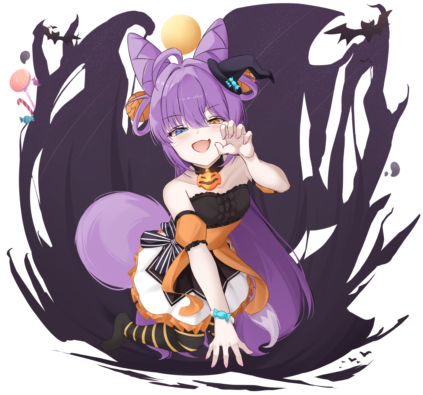 1girlahogealternate costumearmbandbat (animal)black hatblack pantyhoseblack shirtblue eyescandycenter frillsclaw posecone hair bundouble bunfangfingernailsfoodforeshorteningfrilled shirtfrillsfull bodyhair between eyeshair bunhair intakeshair ringshalloweenhalloween costumehand uphatheterochromiajack-o'-lantern broochkneelinglollipoplong bangslong hairlooking at viewermini hatnail polishno shoesopen mouthorange armbandorange eyesorange sashpantyhosepink nailspurple hairshirtsimple backgroundskin fangskirtsmilesolostraight hairstraplessstrapless shirtstriped clothesstriped pantyhosev-shaped eyebrowsvery long hairvirtual youtuberwhite backgroundwhite skirtwitch hat