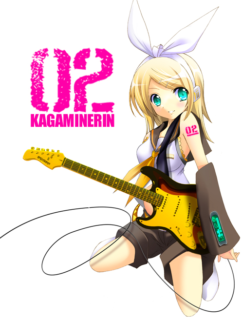 1girlaqua eyesblonde hairelectric guitarfemale focusfender (company)fender stratocasterguitarhair ornamenthair ribbonhairclipheadphonesinstrumentkneelingribbonsailor collarshortssimple backgroundsmilesolo