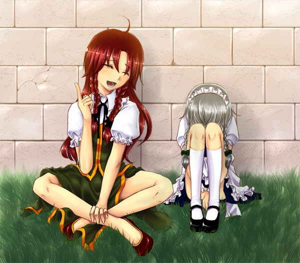 :d1boy2girlsahogebraidchina dresschinese clothesclosed eyesdressfemale focusgrasskneehighslong hairmaidmaid headdressmary janesmultiple girlsno headwearopen mouthred hairshoesshort hairshysmilesockstwin braids