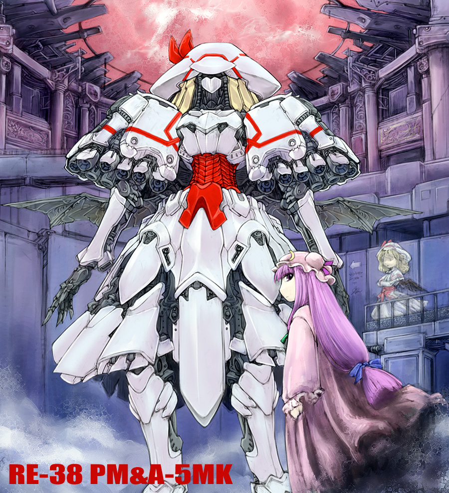 2girlsalternate colorbat wingsblonde hairfemale focushatlong hairmechamechanizationmultiple girlspurple eyespurple hairrobotshort hairskywings