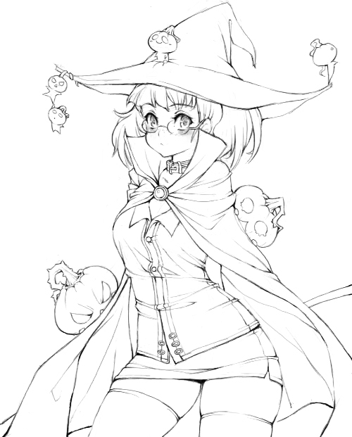 blushcapecollarfrecklesglassesgreyscalehatjack-o'-lanternminiskirtmonochromepumpkinshort hairskirtsolothighhighswitchwitch hatzettai ryouiki