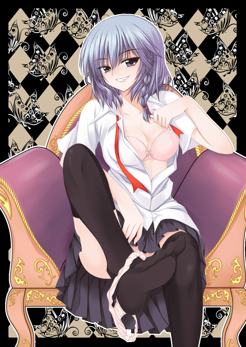 1girlargyle backgroundargyle clothesarmchairblue eyesblue hairbrabraidbreastsbugbutterflychaircleavagefeetfemale focusgrininsectlarge breastslingeriematching hair/eyesnaughty faceno pantiesopen clothesopen shirtpantiespanties around legshirtside braidsingle braidsittingskirtsmilesolothighhighstoestwin braidsunderwearundressing