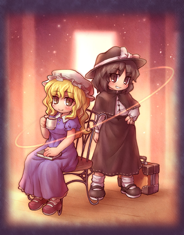 2girlsblack hairblonde hairbookcapeletchaircupfemale focushatmary janesmultiple girlsribbon trimribbon-trimmed capeletshoesshort hairsittingtea