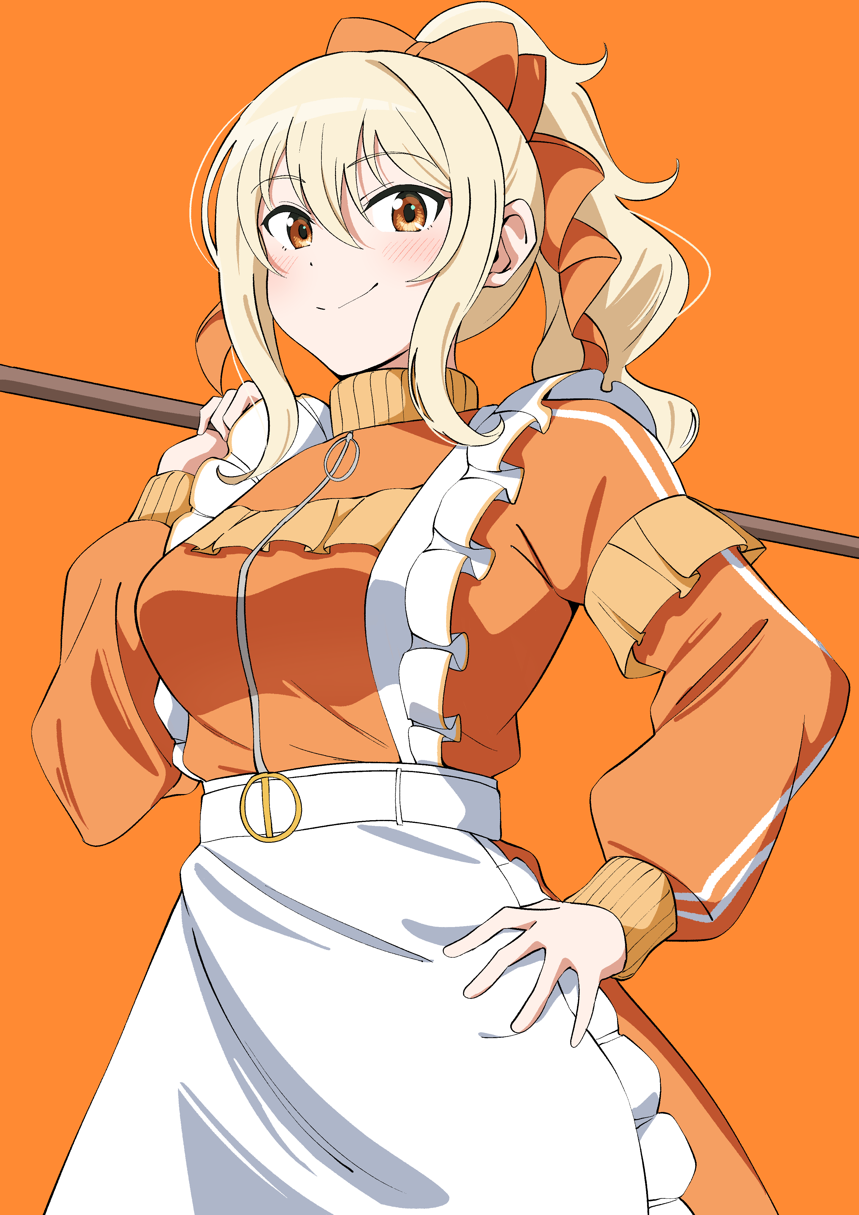 1girlapronblonde hairbowbreastsclosed mouthcowboy shotdressfrilled apronfrillshair between eyeshair bowhand on own hiphigh ponytailholdingjersey maidlong hairlong sidelockslong sleeveslooking at viewermaidmedium breastsofficial alternate costumeorange backgroundorange boworange dressorange eyesponytailpuffy long sleevespuffy sleevessidelockssimple backgroundsmilesolosplit mouthunconventional maidwaist apronwhite apron