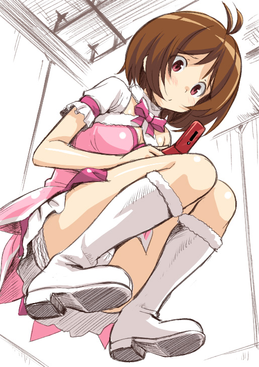 00s1girlantenna hairbootsbreastsbrown haircute & girly (idolmaster)female focusfrom belowfull bodyknee bootslegspantiespartially coloredred eyesshort hairsolosquattingunderwear