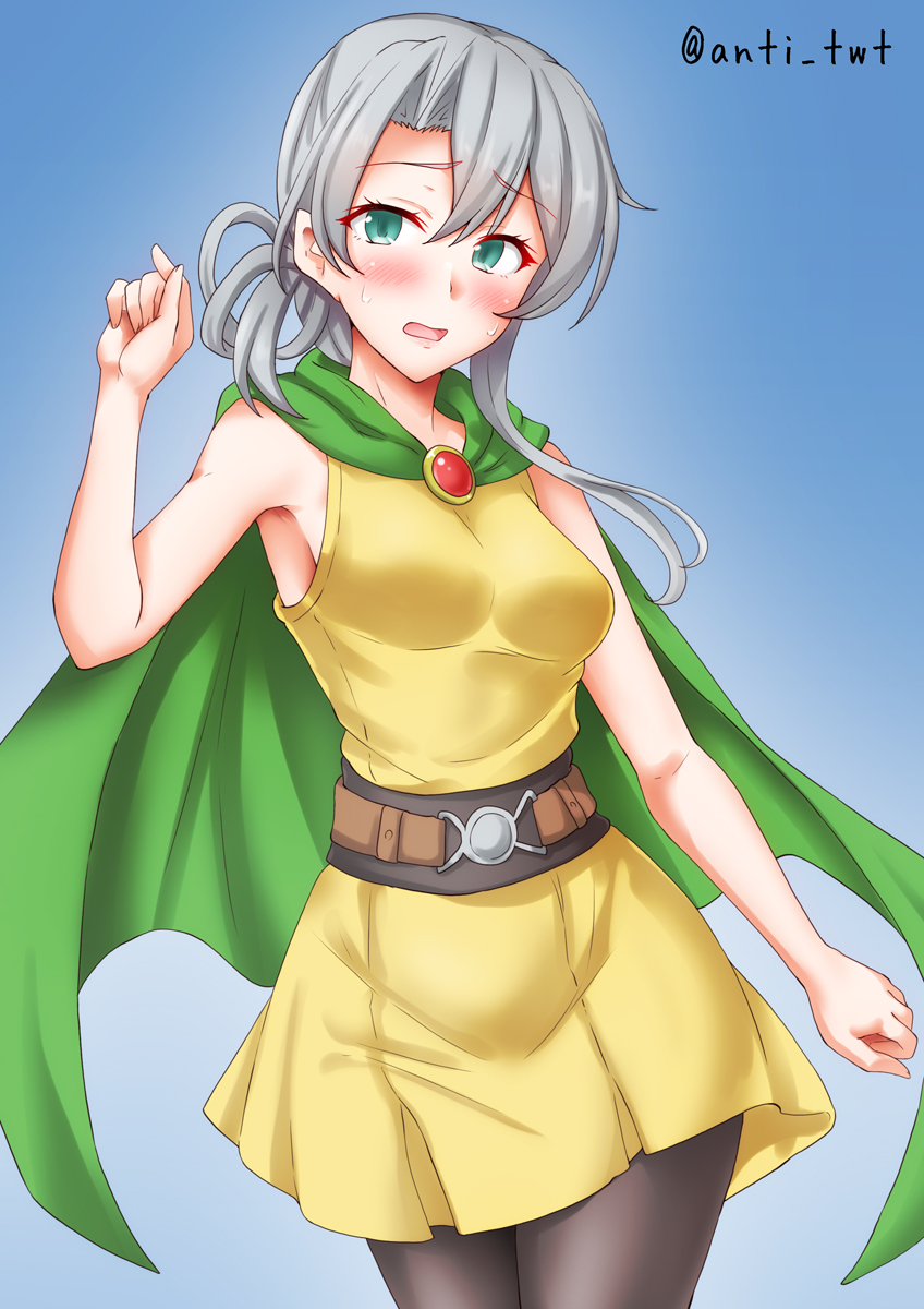 1girlasymmetrical hairblack pantyhoseblue backgroundcapecosplaycowboy shotdressgradient backgroundgreen capegreen eyesgrey hairone-hour drawing challengepantyhoseprincess of samantoria (cosplay)sleevelesssleeveless dresssolotwitter usernameyellow dress