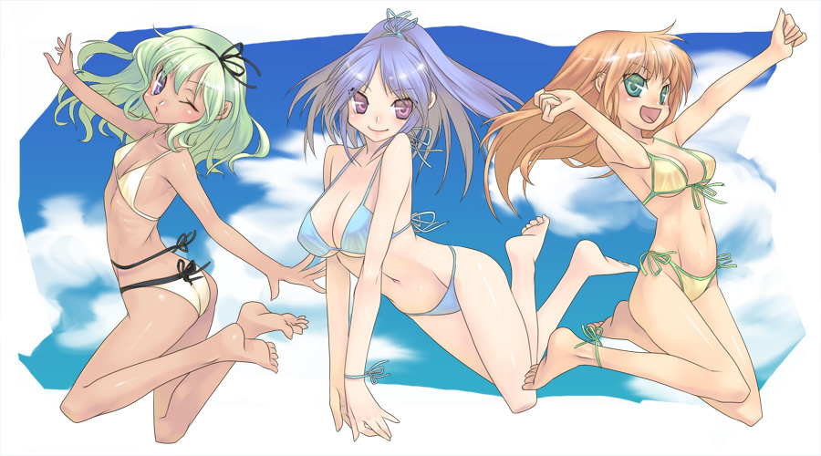 3girlsassbarefootbikiniblue eyesblue hairblushbreastscleavagedark skindark-skinned femalefeetflat chestfront-tie topgreen eyesgreen hairjumpinglarge breastslong hairlooking at viewermultiple girlsnavelone eye closedopen mouthorange hairponytailpurple eyesshiny skinshort hairside-tie bikini bottomsmileswimsuitwink