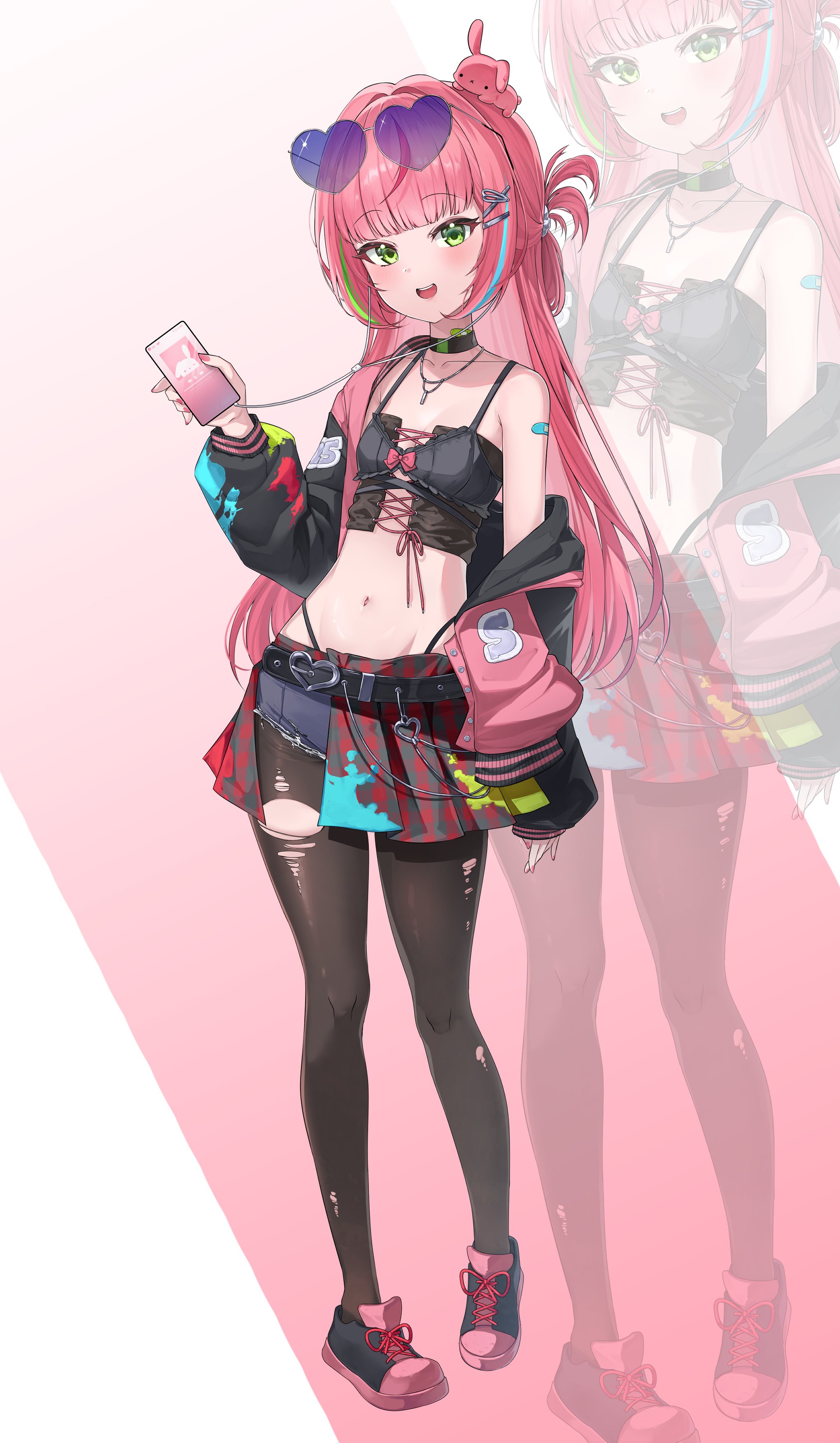 1girlalternate costumearm at sidebandaidbandaid on armbeltbelt buckleblack beltblack chokerblack jacketblack pantyhoseblack shirtbucklecellphonechokercollarbonecrop topcropped shirtcross-laced clothescross-laced topcutoffsdenimdenim shortsearphoneseyewear on headfingernailsfull bodygreen eyesgroinhair intakeshair ornamenthaircliphalf-skirthand upheartheart-shaped buckleheart-shaped eyewearholdingholding phonejacketjewelrylong hairlong sleeveslooking at viewermicro shortsmidriffmulticolored hairmulticolored shoesnail polishnavelnecklaceoff shoulderopen mouthpaint on clothespaint splatterpanty strapspantyhosephonepina artpink hairpink nailspleated skirtshirtshoesshortsshorts under skirtskirtsleevelesssleeveless shirtsleeves past wristssmartphonesmilesneakerssolospaghetti strapstandingstraight hairstreaked hairtorn clothestorn pantyhosetwo-tone backgroundtwo-tone shoesvirtual youtuberwispy bangszoom layer