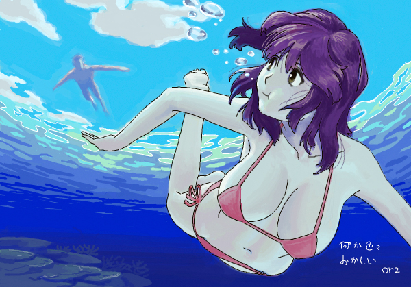 :t1boy1girlbarefootbikinibreastsbrown eyesbubblecleavagefreedivinglarge breastslooking backnaveloutdoorspurple hairshort hairside-tie bikini bottomswimmingswimsuitunderwater