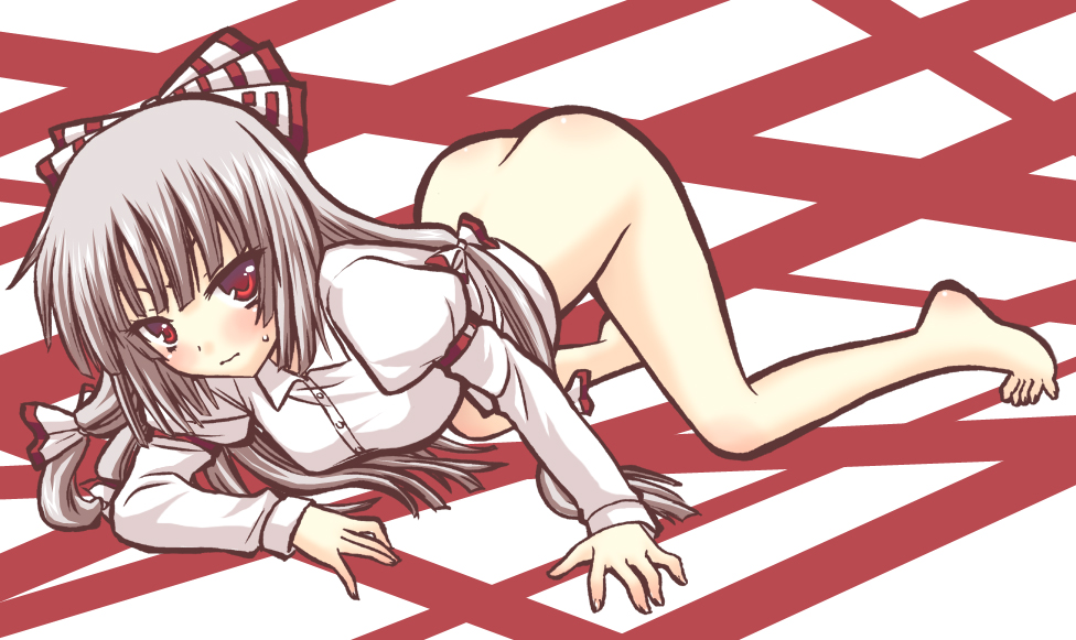 1girlall foursassbarefootblushbottomlessbowdress shirtfemale focusfull bodyhair bowhair ribbonlegslong hairno pantiesred eyesribbonshirtsolo