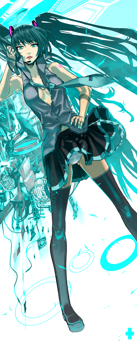 1girlaqua nailsarmpitsbare shouldersbootsbreastscleavagecleavage cutoutclothing cutoutfemale focusfingernailsgreen eyesgreen hairheadsetlegslipslipsticklong hairmakeupmatching hair/eyesnail (hardware)nail polishnecktiepantiespantyshotpleated skirtskirtsolothigh bootsthighhighstwintailsunderwearvery long hairzettai ryouiki