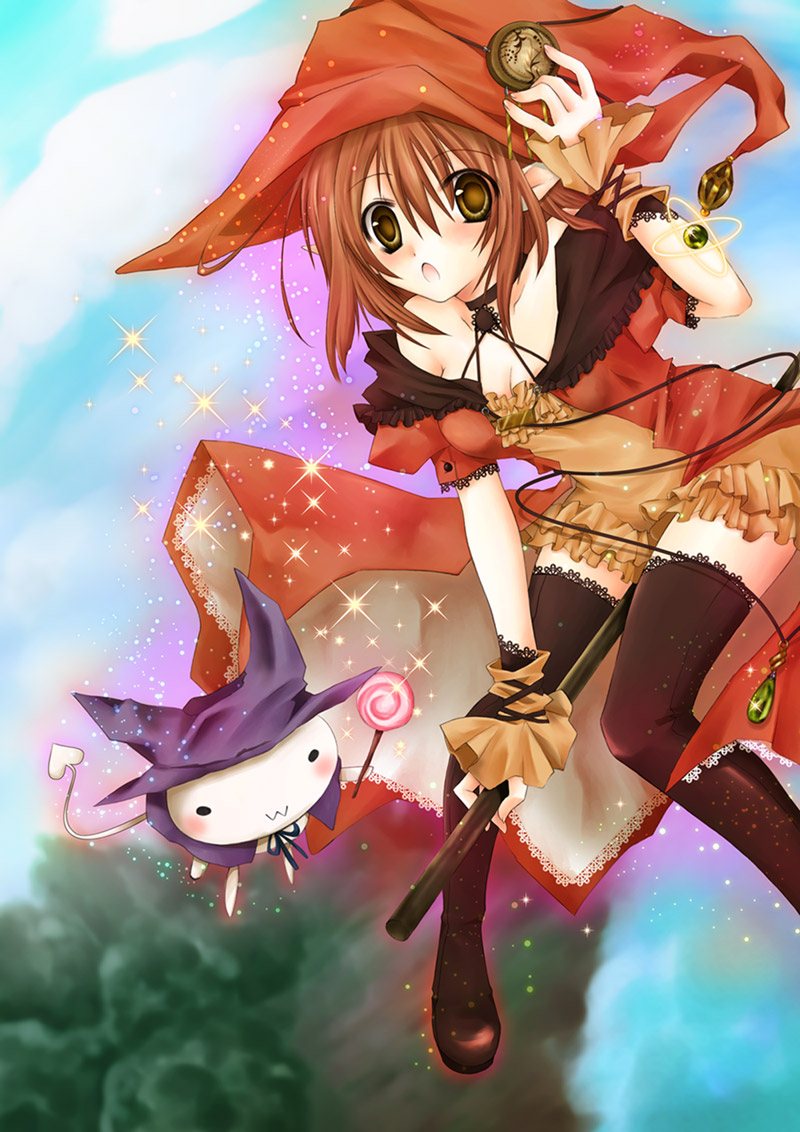 1girlbare shouldersblushbootsbreastsbroombrown eyesbrown haircandychokercleavagedressfemale focusfoodfrillsglowinghatlollipopmagicopen mouthpointy earssmall breastssolosparklesurprisedswirl lollipopthigh bootsthighhighswitchwitch hatwrist cuffszettai ryouiki