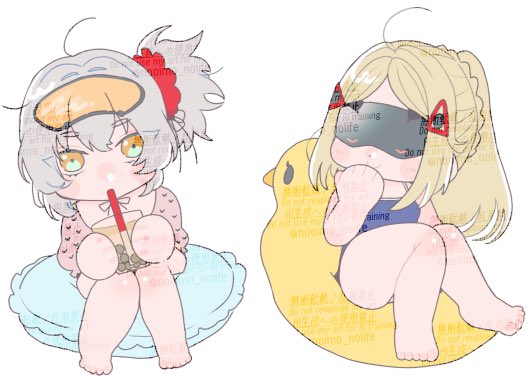 2girlsalternate costumebarefootblindfoldblonde hairblunt bangsblushbrown eyeschibiclosed mouthdrinkingfeetfull bodygogglesgoggles on headhair between eyeslong hairlooking at anotherlooking at viewermultiple girlsside ponytailsidelockssimple backgroundsittingsmilewhite backgroundwhite hairyuri
