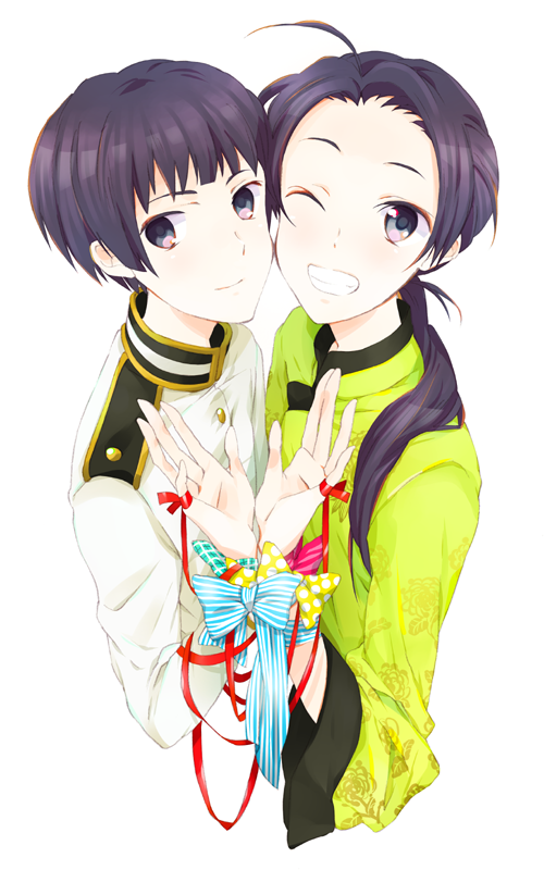00s2boysahogeblack eyesblack hairbowchangpaochina dresschinese clothescoupledressformal clothesmale focusmilitarymilitary uniformmultiple boysone eye closedponytailribbonshort hairsmileupper bodywhite backgroundwink