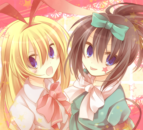 :p00sblack hairblonde hairblue eyesblushbowhair bowhairbandlong hairponytailstar (symbol)tonguetongue out