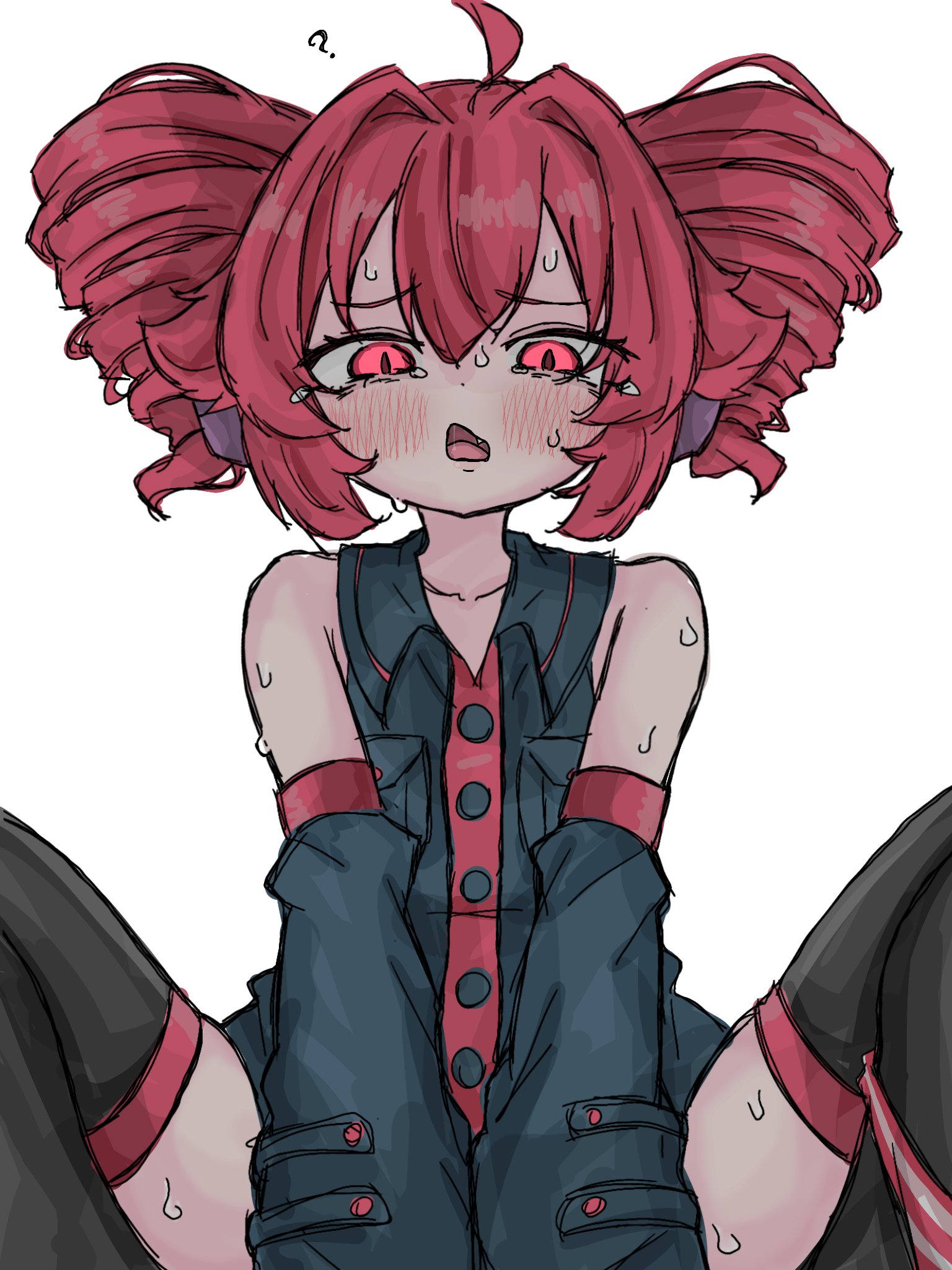 1boy1girlahogebare shouldersblack shirtblack sleevesblack thighhighsblushcollarbonecovering crotchcovering privatescowboy shotdetached sleevesdrill hairfanghair between eyesheadphoneslong sleeveslooking at vieweropen mouthred eyesred hairshirtsimple backgroundsittingsleevelesssleeveless shirtsolospread legssweatthighhighstwin drillswhite background