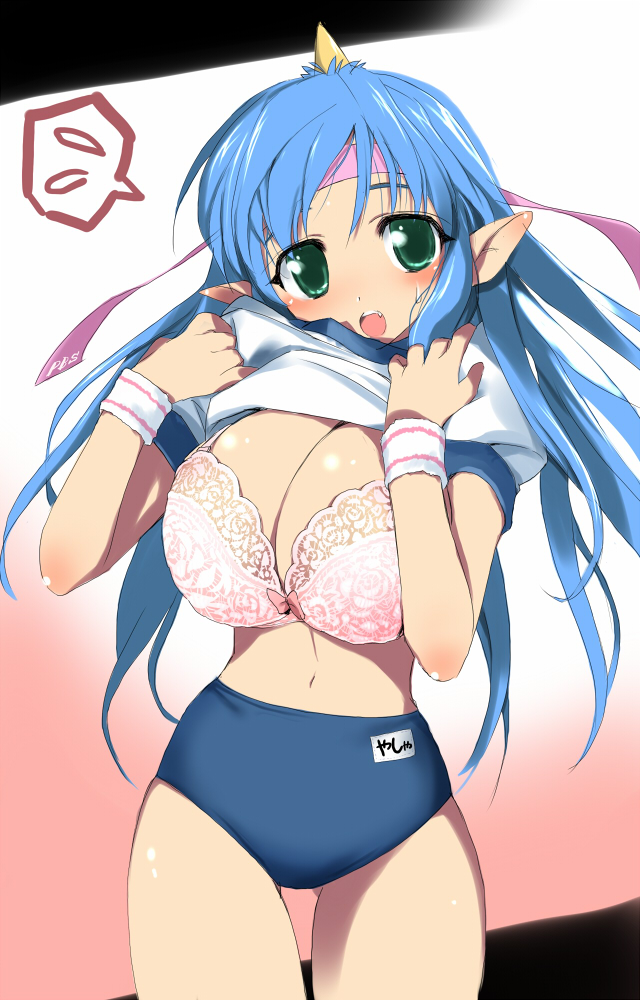 :o1girlblue hairblue oniblushbowbow brabrabreastsburumacleavageclothes liftdemon girlfangfemale focusflying sweatdropsgradient backgroundgreen eyesgym uniformheadbandhornshuge breastslacelace trimlace-trimmed bralingerielong hairlooking at viewername tagnavelonipink brapointy earsshirtshirt liftsingle hornsolospeech bubblespoken sweatdropstandingsurprisedsweatdropt-shirtunderwearundressingwristband