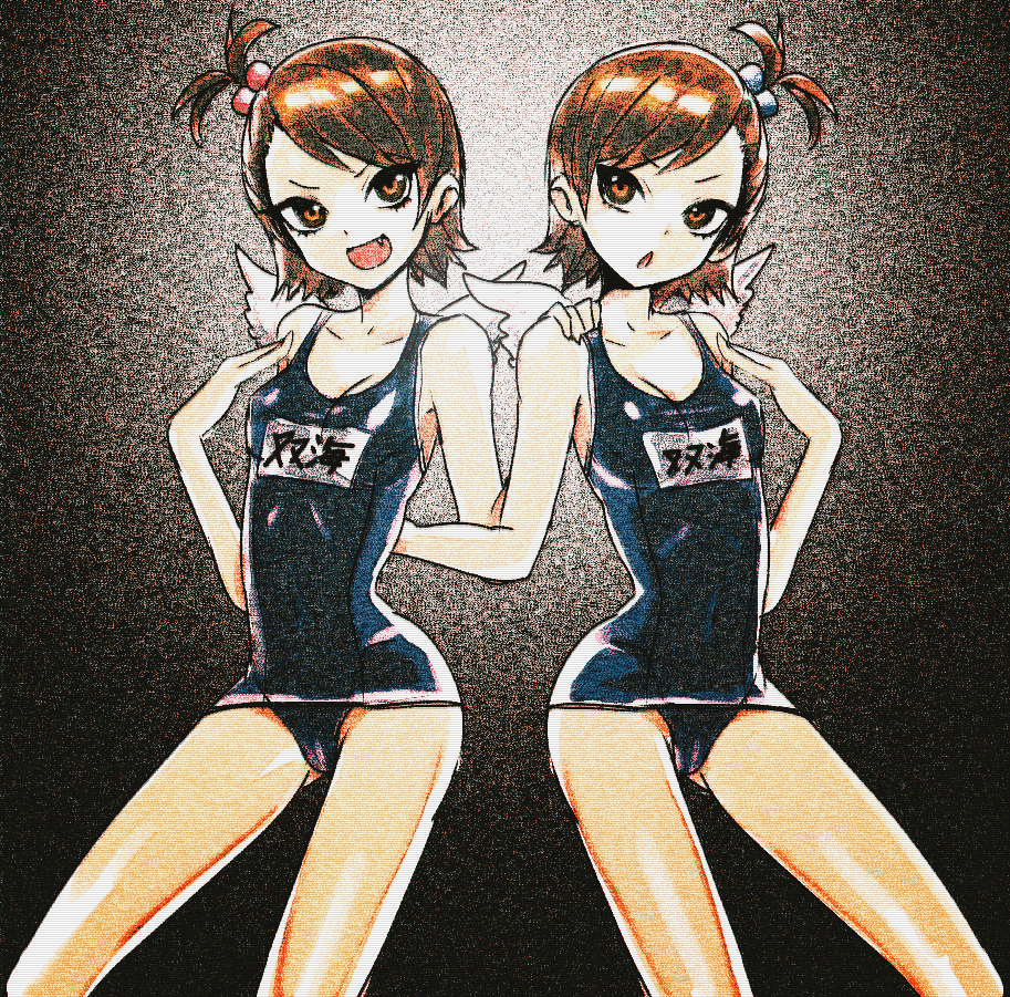 00s2girlsblack one-piece swimsuitbrown eyesbrown hairfanghair bobbleshair ornamentmultiple girlsone-piece swimsuitopen mouthschool swimsuitshort hairsiblingssistersswimsuittsurimetwinswings