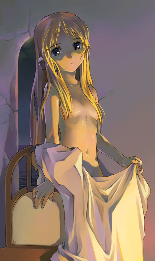 1girlbed sheetblonde hairblue eyescensoredchairconvenient censoringcovering privatesfemale focusflat chestgroinhair censorhair over breastship boneslong hairnaked sheetnavelnudenude covershadesolo