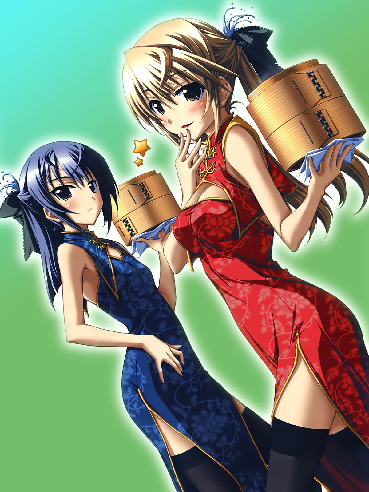 2girlsblack thighhighsblonde hairblue hairblushbowbreastsbrown eyeschina dresschinese clothescleavagedressflat chesthair bowmedium breastsmultiple girlsponytailpurple eyesside slitthighhighs