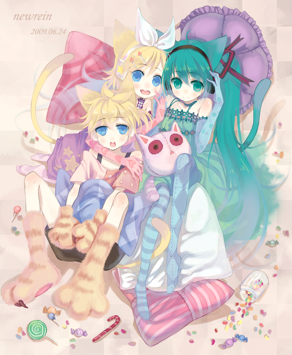 1boy2girlsahogeanimal earsaqua eyesaqua hairargyle clothesasymmetrical legwearblonde hairblue eyesblue glovescandycat earscat taildatedelbow glovesfoodgloveshair ornamenthair ribbonhairclipheadphonesheartheart hair ornamentheart printholding handsjelly beanlollipopmismatched legwearmultiple girlspillowpink glovesprint glovesribbonshortssittingsmilesocksstar (symbol)striped clothesstriped socksstuffed animalstuffed catstuffed toyswirl lollipoptail