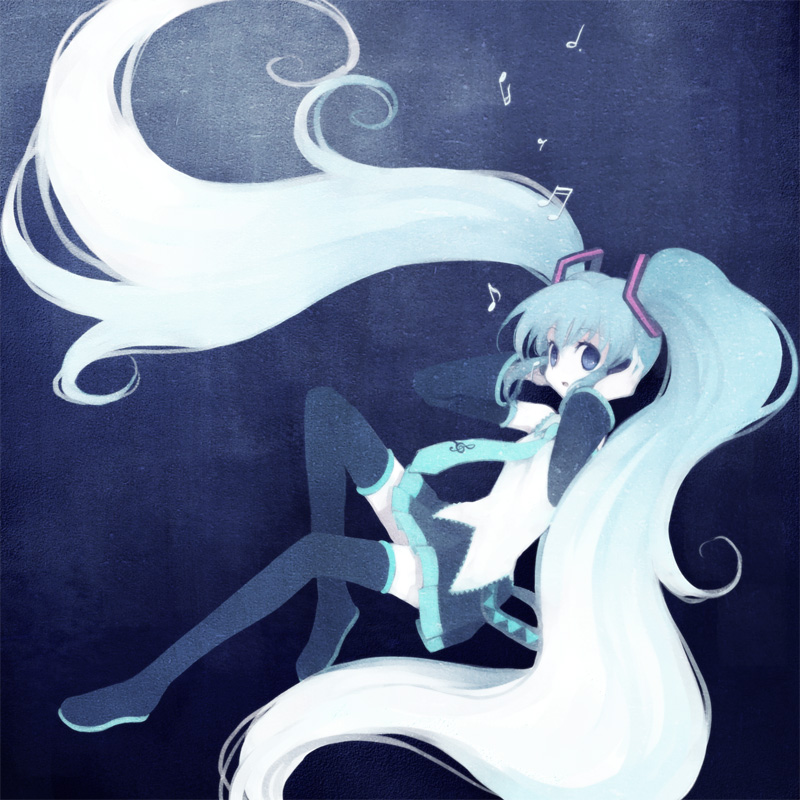 1girlblue eyesblue themebootsfemale focusfloating hairgradient hairhand on own earheadphoneslong hairmulticolored hairmusical notenecktiesolothigh bootsthighhighstwintailsvery long hairzettai ryouiki
