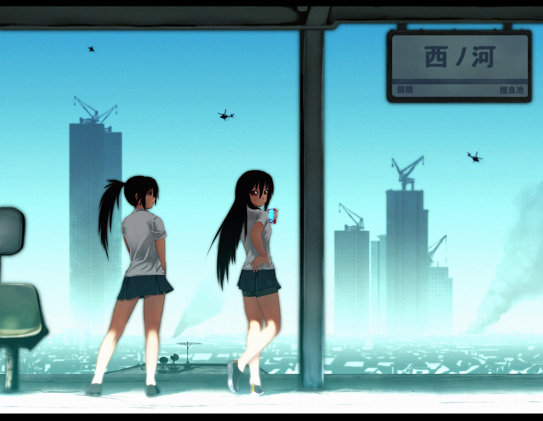 2girlsah-64ah-64 apacheaircraftattack helicopterbike shortsblack hairbuildingfrom behindgunshiphand on own hiphelicopterhelicopter gunshiphip focuslandscapelegsletterboxedlong hairlooking backmilitary vehicleminiskirtmultiple girlsponytailsceneryschool uniformsiblingssistersskirtsmoke