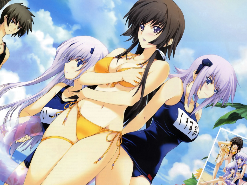 1boy3girlsbeachbikiniblue eyesblushbreastsbrown haircovering breastscovering privatesdayinnertubelarge breastsleaning forwardlong hairmultiple girlsname tagone-piece swimsuitone-piece tanoutdoorspurple eyespurple hairschool swimsuitside-tie bikini bottomswim ringswimsuittantanlineyellow bikini