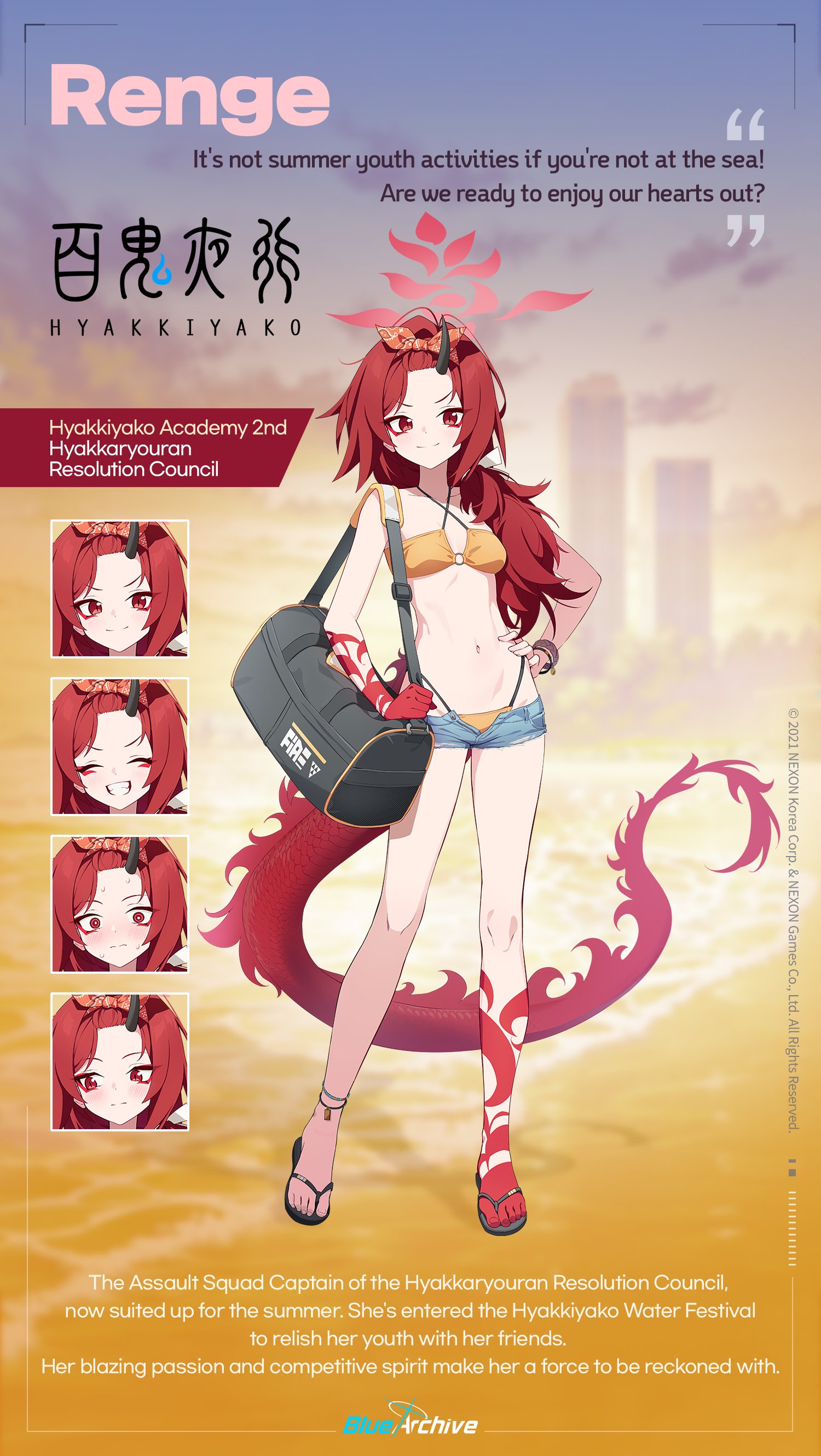 1girlbagbikinibikini bottom under shortsbikini under clothesblack hornsblack sandalsblue shortsblushbreastscharacter nameclosed mouthcopyright logoenglish textfull bodygrinhalohalterneckhornslogolong hairlooking at viewermedium breastsmultiple expressionsnavelofficial alternate costumeparted bangsred eyesred hairred halosandalsshort shortsshortsshoulder bagsingle hornsmilestandingswimsuittailyellow bikini