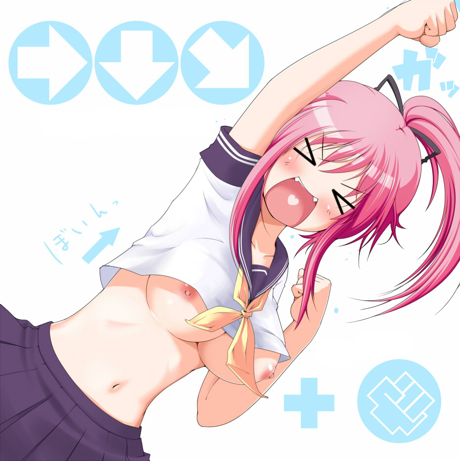 :d1boy1girlbreastsclosed eyescommand inputdutch anglefangfangsfemale focusgameplay mechanicsheartlarge breastslong hairnavelnipple slipnipplesno braopen mouthparodypink hairponytailschool uniformserafukushouryuukensmilesolounderboobuppercutwardrobe malfunctionxd