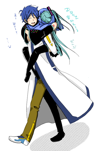 1boy1girlaqua hairblue hairblue scarfclosed eyesdetached sleevesholdinglong hairscarfshared clothesshared scarfskirtthighhighstwintailswalking