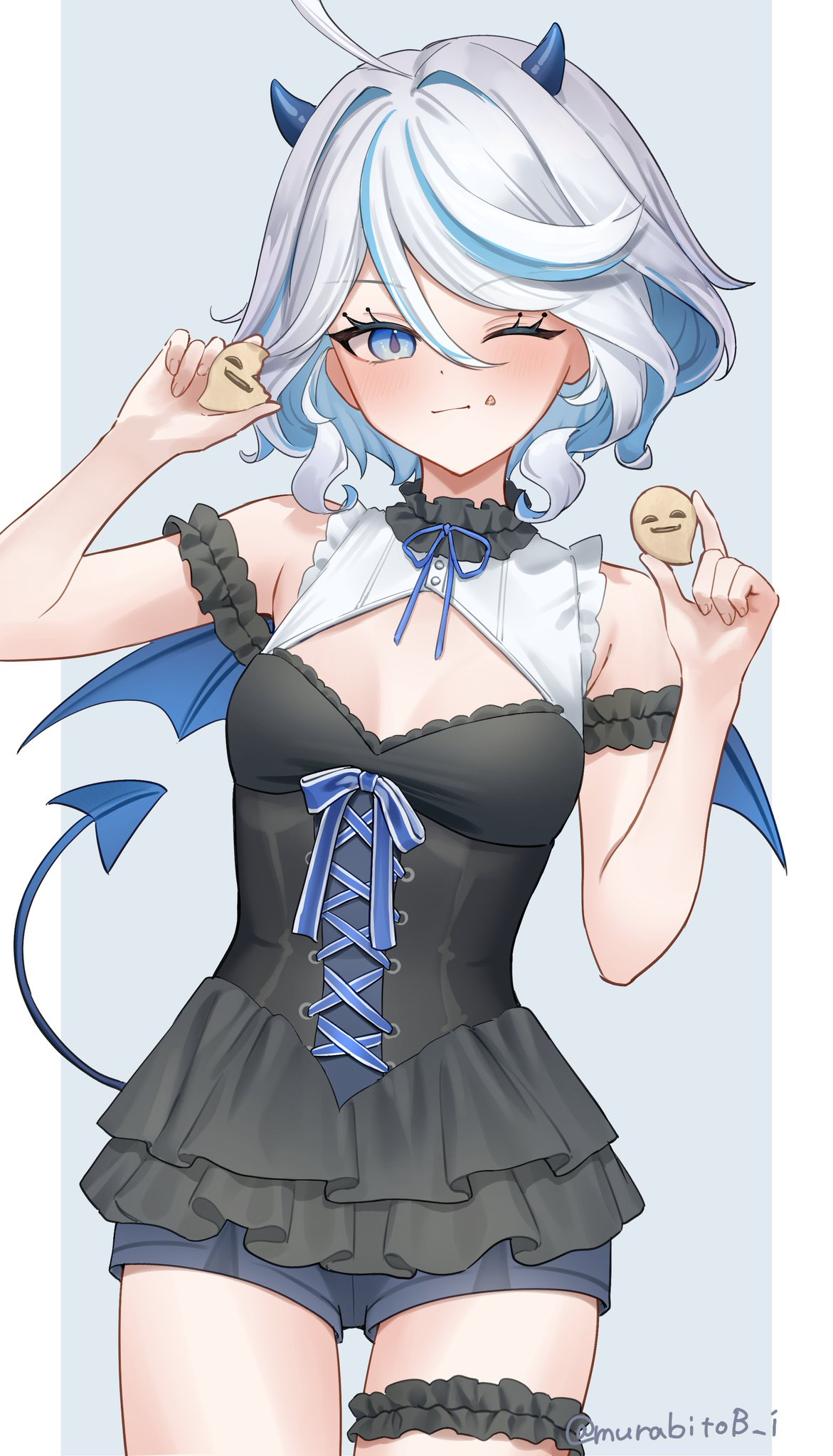 1girlalternate costumeblack shirtblack shortsblue backgroundblue eyesblushbreastscookiedemon hornsdemon taildemon wingsdrop-shaped pupilseyelash ornamentfoodfood on facehands upholdingholding cookieholding foodhornsone eye closedpillarboxedshirtshort shortsshortssmall breastssolosymbol-shaped pupilstailthigh scrunchiewavy hairwings