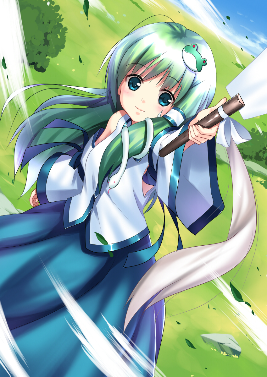 1girldetached sleevesfemale focusfroggoheigreen eyesgreen hairjapanese clothesleafmatching hair/eyesoonusasmilesnakesolowind