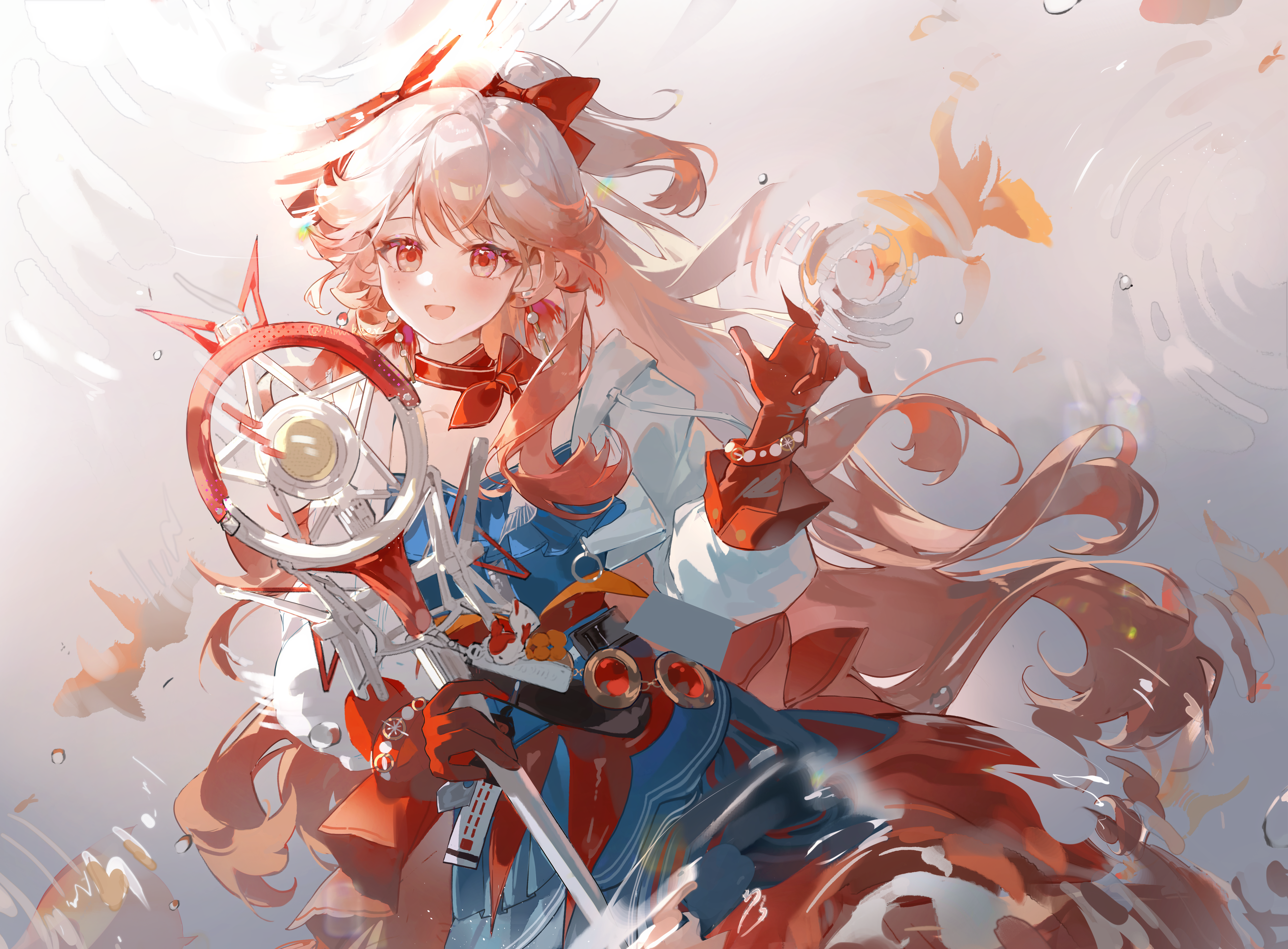 :d1girlblushbowearringsfishglovesgoldfishhair bowholdingholding staffjacketjewelrylong hairlong sleeveslooking at viewermolemole on cheekopen mouthorange eyesorange hairpink hairred bowred eyesred glovesripplesshirtsmilesolostaffvery long hairwhite jacket