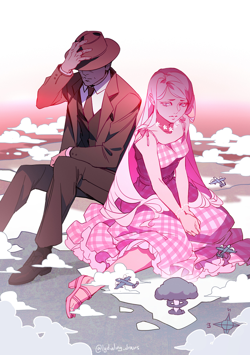 1boy1girlaircraftairplanebarbenheimer (meme)black hatblack jacketblack necktieblack pantsblack shoesblack suitblue eyesbreastsclosed mouthdressflowerflower necklaceformal clotheshand on headwearhathigh heel sandalshigh heelsjacketjewelrylong hairlong sleeveslooking downmememushroom cloudnecklacenecktieopen clothesopen jacketown hands togetherpantspink dresspink hairpink sandalssandalsshoessittingsleevelesssleeveless dresssmall breastssuit