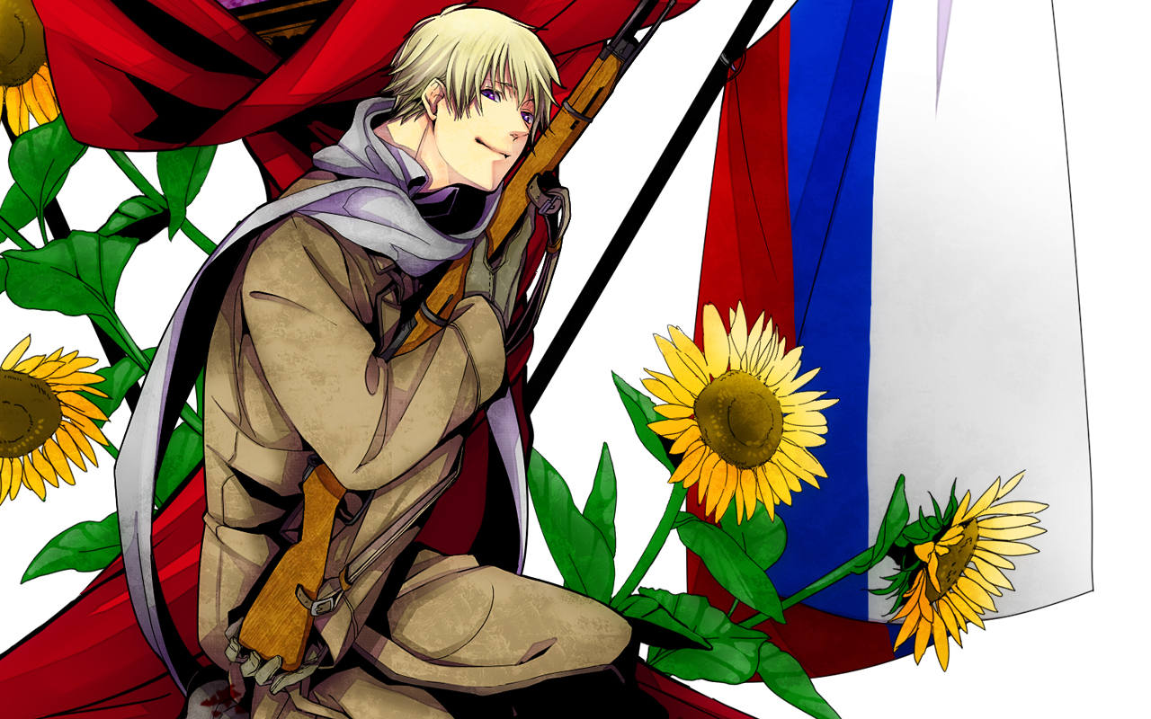 00s1boyblonde hairflagflowergunmale focusmilitarymilitary uniformpurple eyesriflerussian flagscarfsolosunflowerweapon