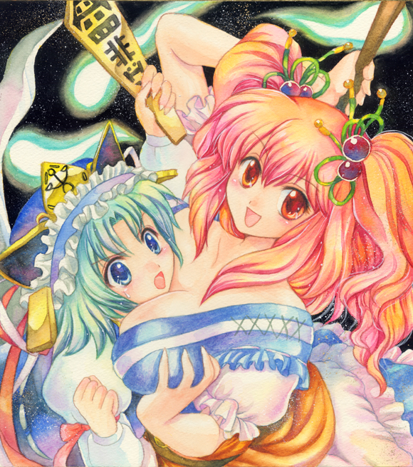 2girlsblue eyesbreastscleavagefemale focusgreen hairhatlarge breastsmultiple girlsred eyesred hairrod of remorseshort hairtwintailstwo side up