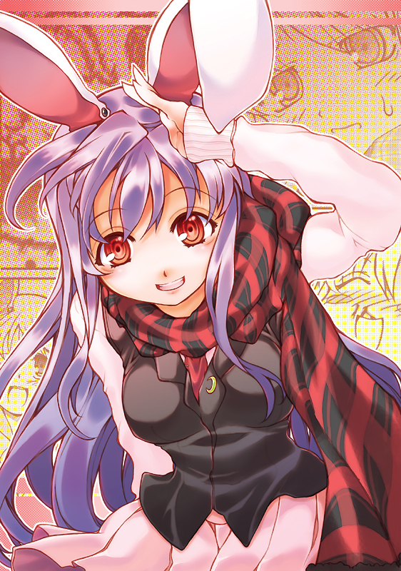 1girlanimal earsblazerbreastsfemale focusgrinjacketlong hairnecktiepleated skirtpurple hairrabbit earsred eyesscarfskirtsmilesolo