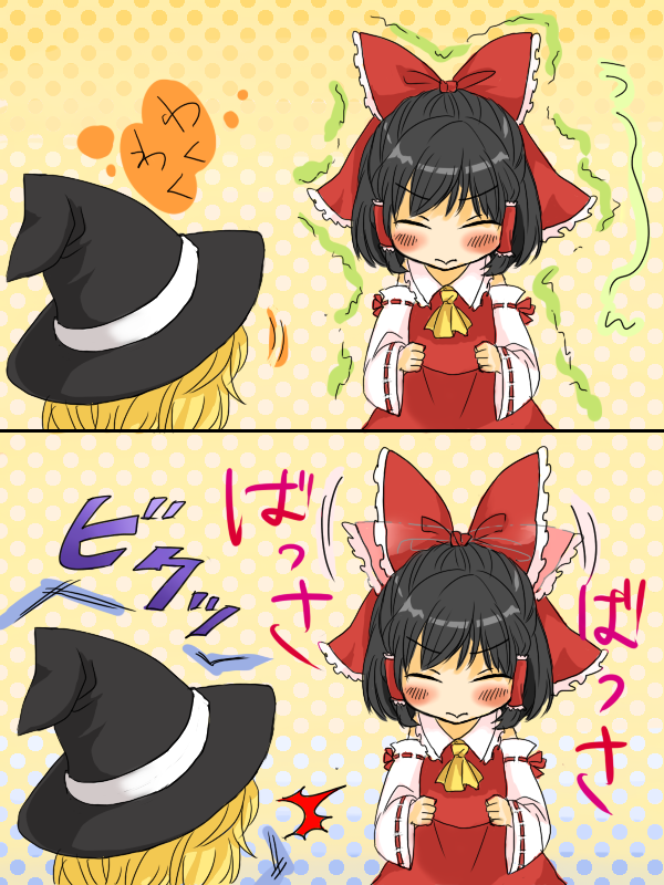 fori, hakurei reimu, yakumo yukari, touhou, 2girls, brown hair, female focus, gap (touhou), hand fan, hat, hug, japanese clothes, miko, multiple girls, red eyes, ribbon