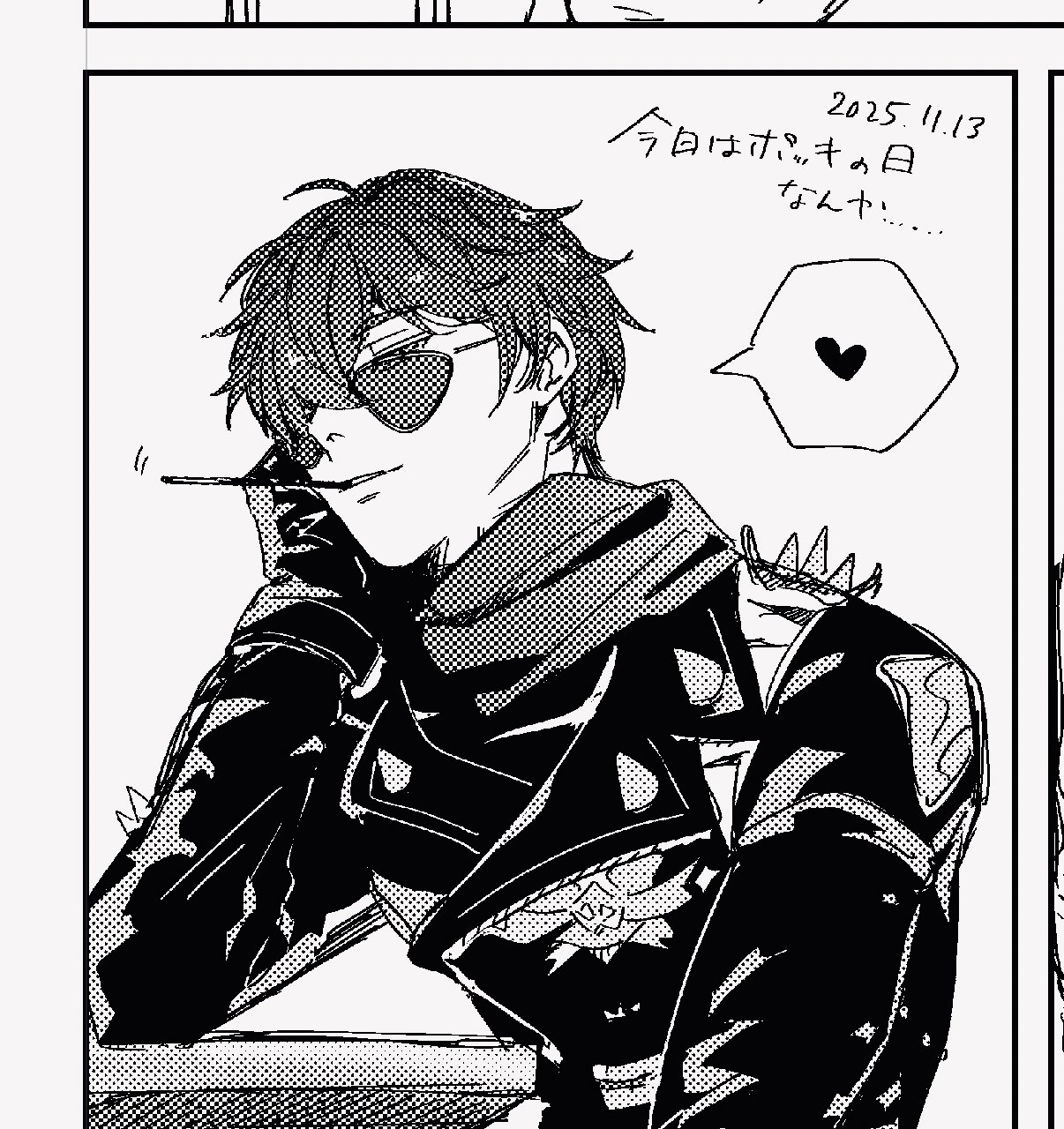 1boyblack jacketdatedfoodfood in mouthgreyscalehair over one eyehead restheartjacketleatherleather jacketlooking over eyewearmale focusmonochromemotion linesparted lipspockypocky in mouthscarfshort hairshoulder spikessolospiked jacketspikesspoken heartsunglassesupper body