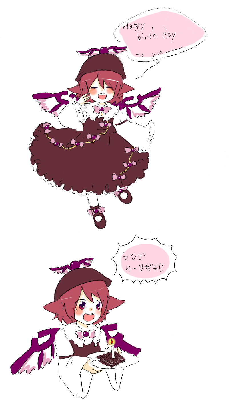 :d1girlanimal earsbirthdaycakecandleclosed eyesdresseelenglish textfemale focusfoodhatlong sleevesopen mouthplatered hairshort hairsmilewings