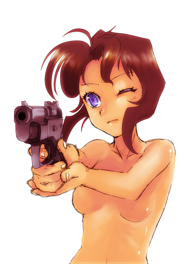 1990s (style)1girlaimingblue eyesbob cutbreastsbrown hairdark skindark-skinned femalefemale focusforeshorteninggunhandgunlipstickmakeupno nipplesnudeone eye closedpistolpurple eyespurple hairretro artstyleshort hairsidelockssoloweaponwink