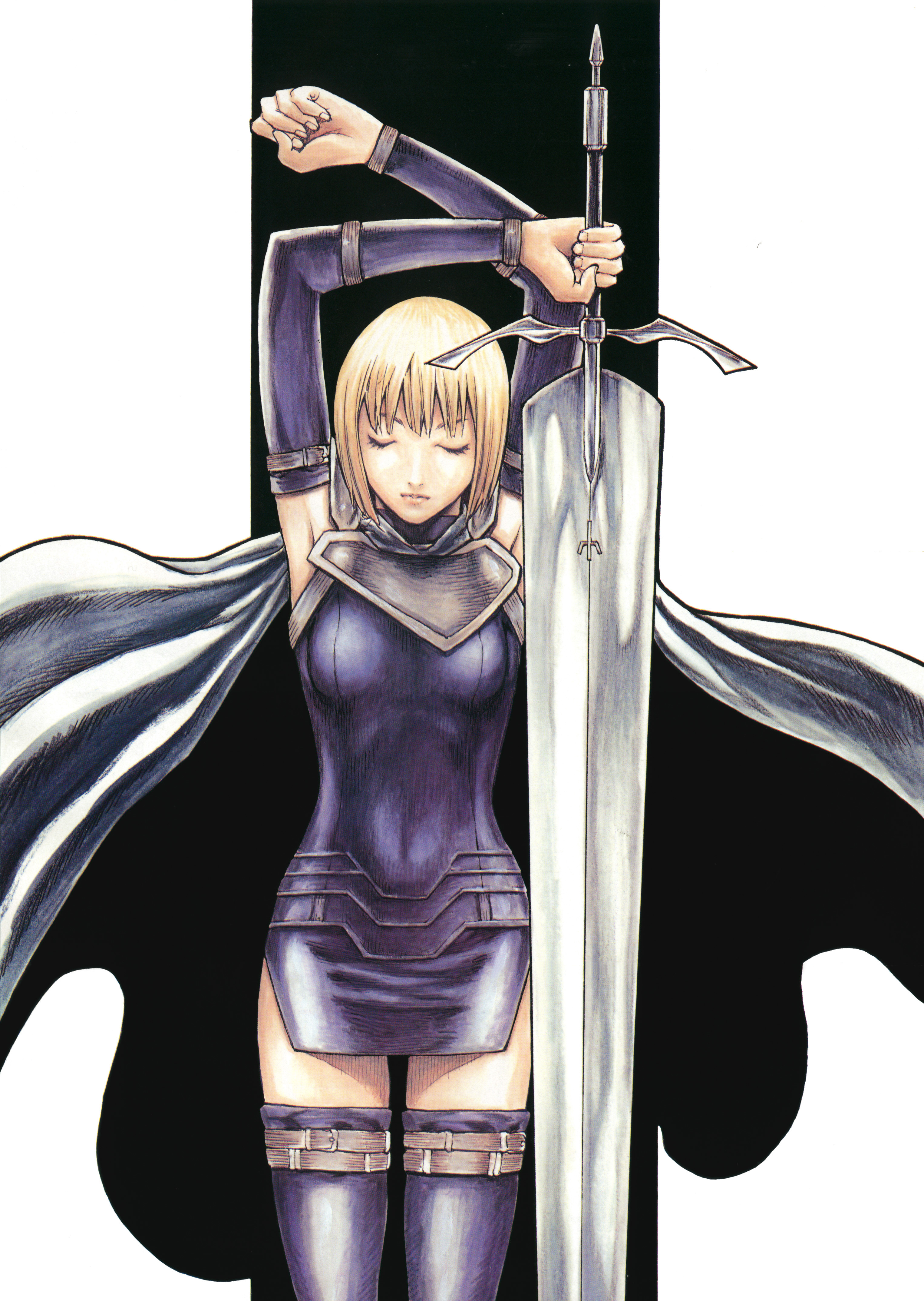 00s1girlarmpitsarms upblonde haircapeclaymore (sword)female focusminiskirtshort hairskirtsoloswordthighhighsweapon