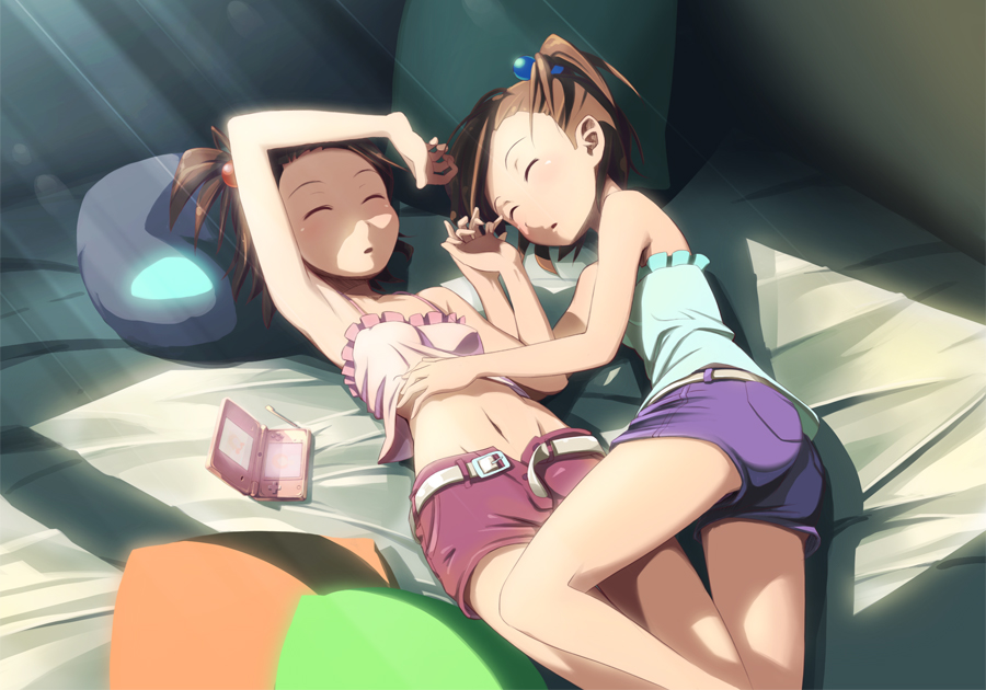 00s2girlsarmpitsbare shouldersbrown hairclosed eyesfemale focushandheld game consoleholding handslolimidriffmorning aftermultiple girlsnavelnintendo dspillowshort hairshort shortsshortssiblingssisterssleepingyuri